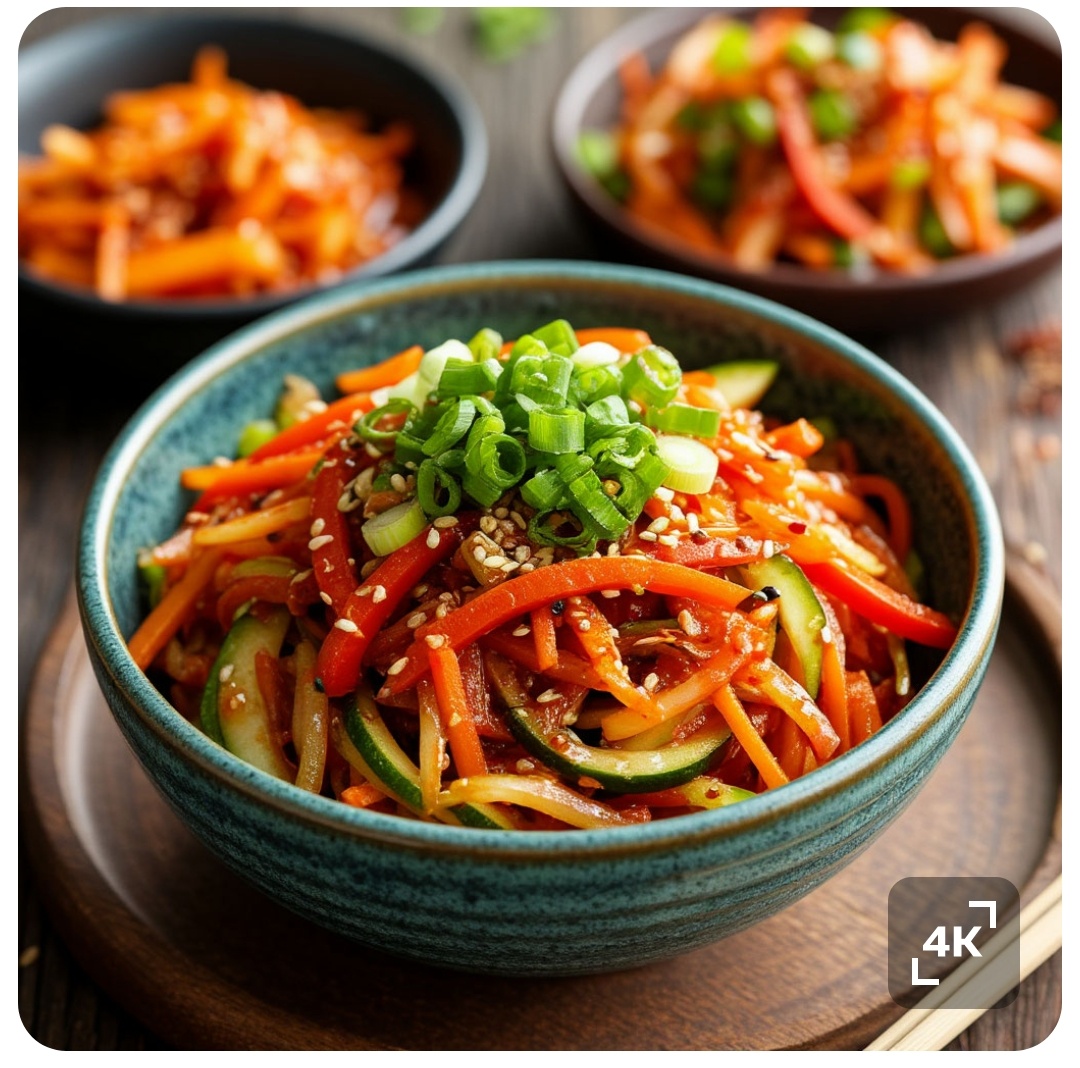 Овощной салат по-корейски — это яркое, острое и очень вкусное блюдо, которое прекрасно подойдет в качестве закуски или гарнира. В основе салата лежат свежие и слегка обжаренные овощи, приправленные пикантным пряным соусом с характерным корейским вкусом. Ниже представлен подробный рецепт приготовления овощного салата по-корейски, который поможет вам создать настоящее кулинарное произведение. Ингредиенты: - Морковь – 3 шт. (среднего размера) - Огурцы – 2 шт. - Болгарский перец – 1 шт. - Репчатый лук – 1 шт. - Чеснок – 3 зубчика - Зеленый лук – 2-3 пера - Кинза (по желанию) – небольшой пучок - Растительное масло – 3-4 ст. ложки - Уксус яблочный или рисовый – 1 ст. ложка - Сахар – 1 ч. ложка - Соль – по вкусу - Красный острый перец молотый или сушеный чили – 0,5-1 ч. ложки - Соевый соус – 1 ст. ложка - Кунжутные семечки – 1 ст. ложка (для украшения) 1. Подготовка овощей. Морковь очистите и натрите на крупной терке или нарежьте тонкой соломкой. Огурцы промойте и нарежьте тонкими полоска
