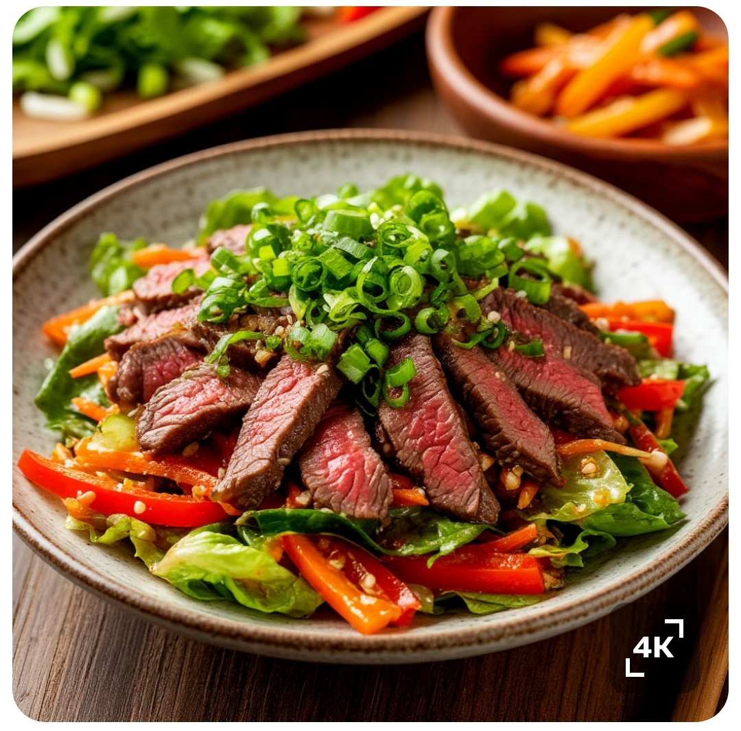 Салат с говядиной и овощами по-корейски — это яркое, сочное и ароматное блюдо, которое порадует любителей корейской кухни и тех, кто ценит пикантные и освежающие закуски. Такой салат прекрасно подойдет как для праздничного стола, так и для повседневного ужина. В этом рецепте рассказано как приготовить этот салат в домашних условиях, используя простые ингредиенты и традиционные корейские специи. Ингредиенты: - Говядина (лучше вырезка или тонкий край) — 300 г - Морковь — 2 средние - Болгарский перец — 1 шт. - Лук репчатый — 1 шт. - Чеснок — 2 зубчика - Зеленый лук — 2 пера - Кинза — небольшой пучок (по желанию) - Растительное масло (лучше кунжутное) — 2 ст. ложки - Соевый соус — 3 ст. ложки - Уксус рисовый или яблочный — 2 ст. ложки - Сахар — 1 ч. ложка - Красный молотый перец (чили) — по вкусу - Кунжут — 1 ст. ложка - Соль — по вкусу Приготовление: 1. Подготовка говядины. Промойте мясо, обсушите бумажным полотенцем. Нарежьте тонкими полосками поперек волокон, чтобы мясо было мягким.
