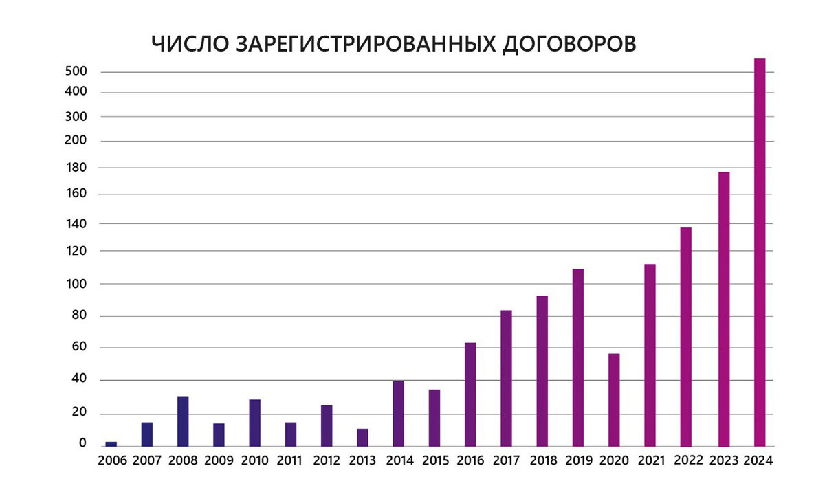 Итак, 2025-й. На фоне рекордного прошлого года рост оказался более скромным, но все равно позитивным. По данным за первые девять месяцев года, зарегистрировано 257 договоров — это вдвое меньше, чем в прошлом году, но больше, чем в 2023-м (175).