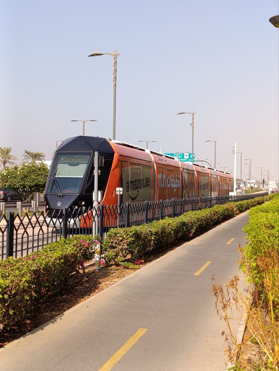 Дубайский трамвай Дубайский трамвай — это современная транспортная система, запущенная в 2014 году. Его пути протянулись на 14,5 километров, соединяя Дубай Марину с Палм-Джумейрой и Аль-Суфух. На маршруте три пересадки: две на метро и одна на монорельс, но расстояния между ними значительные, что делает пешую пересадку не такой комфортной. Трамвай использует наземную систему электроснабжения, что избавило улицы Дубая от проводов. На всем протяжении маршрута действует система APS (Alimentation par Sol или «питание от земли»), поэтому трамваи используют пантографы только в депо. В составе трамвайного парка 11 семисекционных трамваев Alstom Citadis 402. Каждый из них длиной около 44 метров вмещает до 408 пассажиров. Максимальная скорость трамвая составляет 50 км/ч, при этом средняя скорость составляет около 20 км/ч. По моим наблюдениям, дубайский трамвай имеет абсолютный приоритет на всем участке путей. Причем как над автомобилями, так и над пешеходами. Например, в случае приближения т