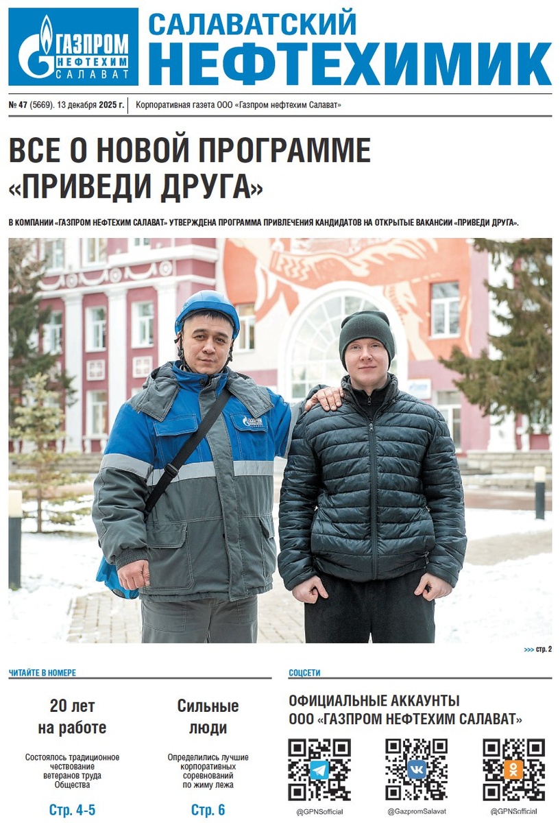Новый номер корпоративной газеты #ГазпромнефтехимСалават на сайте компании👇 https://salavat-neftekhim.gazprom.ru/d/journal/35/565/25-12-13.pdf