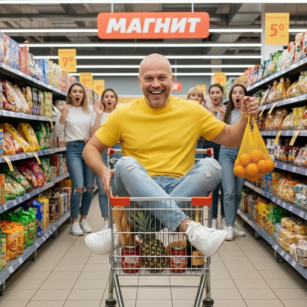 '. Мужчина в желтой модной футболке, светло-синии потертые джинсы, белые модные кроссовки. Он мчится на камеру в магазинной тележке, сидя вальяжно внутри, ноги снаружи закинута одна на другую. А на заднем плане видны удивлённые посетители магазина. В одной руке — авоська мандаринов, в другой — бутылка советского шампанского. В тележке — батон, банка икры, ананас, шампанское . Эмоция: веселье. Не меняй черты лица даже на 1% 👉Все ссылки ТУТ 👉канал в Дзен