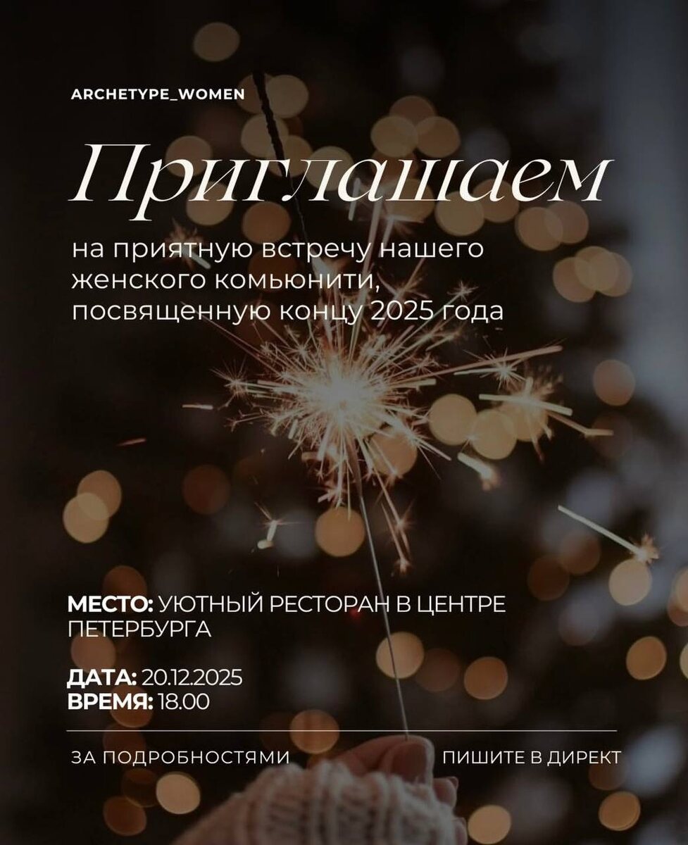 Предновогодняя встреча Девушки, кто с нами? Мы с командой пространства «Архетип» предлагаем Вам предновогоднюю встречу в женском кругу за ужином 💃🎄🥂 Будет красиво, психологично, познаем новое из области ароматерапии (будет специалист по арома маслам и визажу), поболтаем, познакомимся и просто отдохнем. Описание прикрепляю ниже в комментах или тут https://www.instagram.com/p/DSIgYKtiDy7/?igsh=bTRsazJkOWk0eHNu Кто хочет подарить себе любимой незабываемый вечер, сделать что-то непривычное для себя и остановить мгновенье - пишите! Стоимость 3500 Включено: Игристое, вкусности, чай/кофе, приятное окружение, хорошее настроение, познавательные инициации от психолога и арома специалиста. #женскаяновогодняявстреча #подароксебе #начниизменения