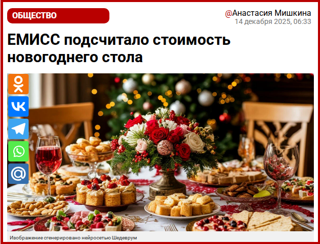 По мотиву хита Игоря Николаева. Чем ближе новогодняя ночь - тем тревожнее на душе. И пугает уже не очередной рост цен, запущенный объяснениями высших чинов Минфина о неизбежности повышения налогов. И даже не псевдокачество продуктов с обоснованным отсутствием ГОСТов. Это страшно, но народ не ропщет. Раздирает душу неотступный страх. Неконтролируемый, давно уже не поддающийся аффирмациям. Самовнушение не спасает. Это страх неизвестности, страх неверия в завтрашний день... Что уж говорить о послепраздничном настроении! Пенсии за январь получим в предновогодье. Повышенные пенсии, но надбавка уже «съедена» инфляцией этого года. Закупимся на праздничный стол... Скриншот с сайта www.osnmedia.ru https://www.osnmedia.ru/obshhestvo/emiss-podschitalo-stoimost-novogodnego-stola/?utm_source=yxnews&utm_medium=desktop&utm_referrer=https%3A%2F%2Fdzen.ru%2Fnews%2Finstory%2Faf4cce3c-38a3-50e7-b978-05f8541bd78c Вот