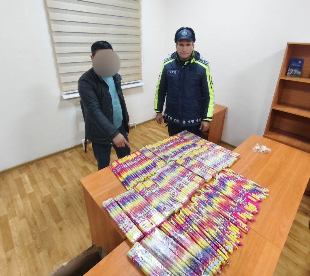 14 декабря около 18.00 в Бектемирском районе инспектор ДПС ГУБДД ГУВД Ташкента остановил автомобиль Cobalt, в котором были выявлены пиротехнические изделия. В присутствии понятых проведен осмотр транспортного средства, в ходе которого в багажнике обнаружены 378 пиротехнических изделий. По данному факту оформлены соответствующие материалы. Гражданин передан в профильную службу.