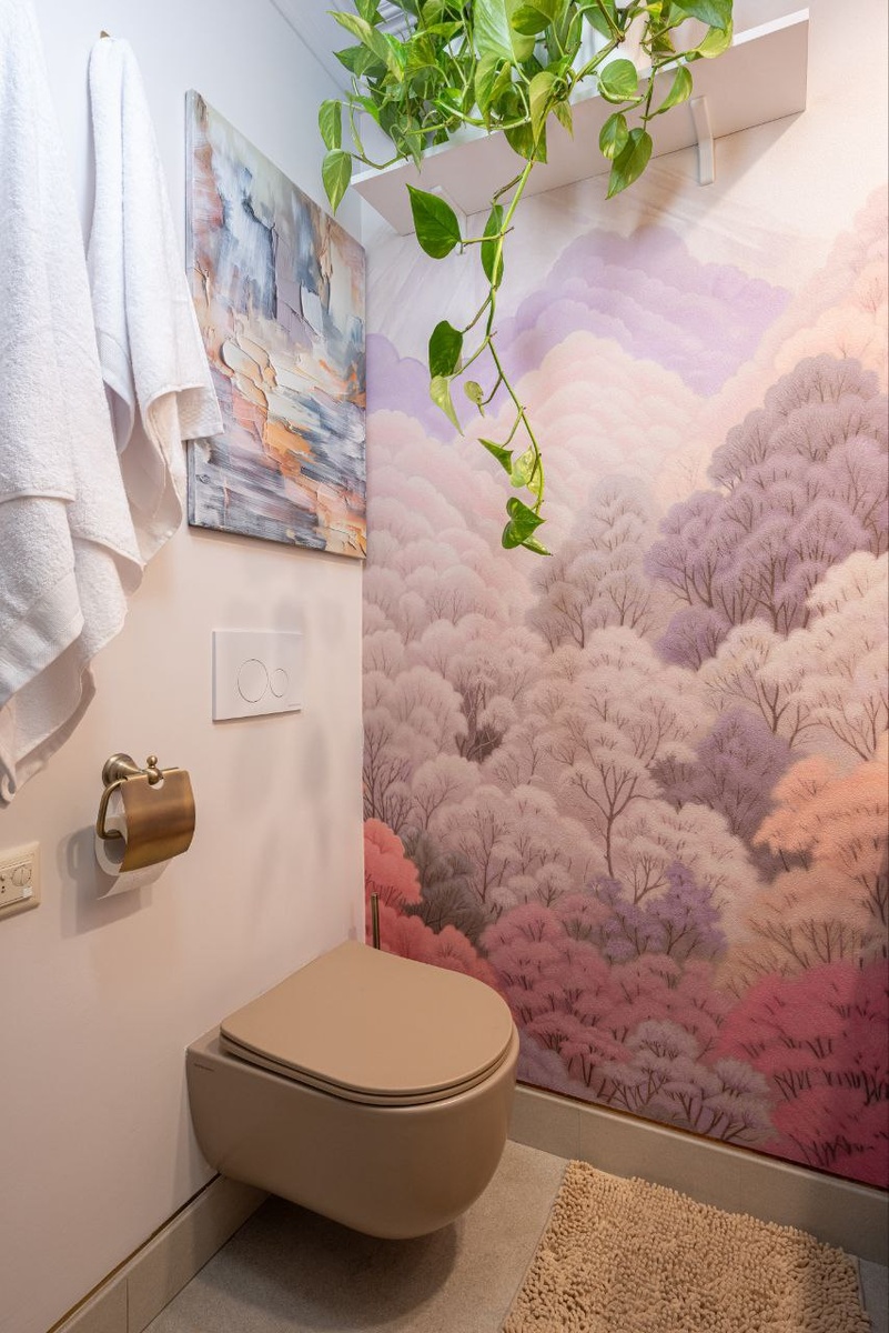 В программе "Большие перемены" переделывали санузел. Дизайнер – Ануш Аракелян. Санузел оформлен в утончённом и уютном стиле. Особое внимание привлекают настенные обои из коллекции #Wallpaperpart3@affrescoru (арт. AF2307-COL2) на одной из стен — они являются главным акцентом интерьера. Обои представляют собой художественную композицию с изображением леса: множество деревьев выполнены в мягких, пастельных оттенках — преобладают светло-розовые, сиреневые, лавандовые и бежевые тона. Рисунок выглядит объёмно и живописно, создаёт ощущение глубины и лёгкости, словно переносит в сказочный лес. Такой дизайн придаёт помещению атмосферу спокойствия и умиротворения, визуально расширяет пространство. - При помощи фресок и обоев в ванных комнатах можно создавать эксклюзивные авторские решения. Для изготовления фресок в мокрых зонах, в нашем ассортименте есть специальный влагостойкий материал - Sabbia. 🔸️Особенности материала Sabbia: ✔️Полотно дополнительно покрывается двусторонней гидроизоляшие