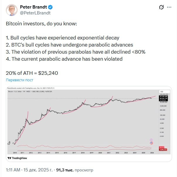Инвесторы в биткоин, знаете ли вы: Бычьи циклы демонстрируют экспоненциальное затухание (роста). Пояснение: Пики каждого следующего бычьего рынка (в процентах) становятся меньше предыдущего. Бычьи циклы BTC развивались по параболической траектории. Пояснение: Рост цены во время каждого цикла происходил по параболической кривой, которая в итоге нарушалась. Нарушение предыдущих парабол каждый раз приводило к падению >80% от пика. Пояснение: После прорыва ниже параболической кривой роста цена падала более чем на 80% от исторического максимума (ATH) того цикла. Текущая параболическая траектория роста уже нарушена. Логический вывод автора: Сейчас мы наблюдаем аналогичную ситуацию – цена пробила параболу роста. Если история повторится, следует ожидать значительного снижения. 20% от ATH = $25,240 Расчет: Автор предполагает, что падение может составить >80% от последнего исторического максимума (~$69,000). 20% от этой суммы — примерно $13,800, но указанная им цена $25,240, скорее все