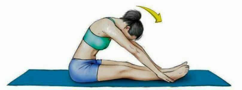 - В первом варианте: сидя, ноги в стороны. На выдохе делаем наклон вперед, фиксируем положение на 5-6 секунд. На вдохе, корпус выпрямляем, делаем ещё 5-8 повторов.