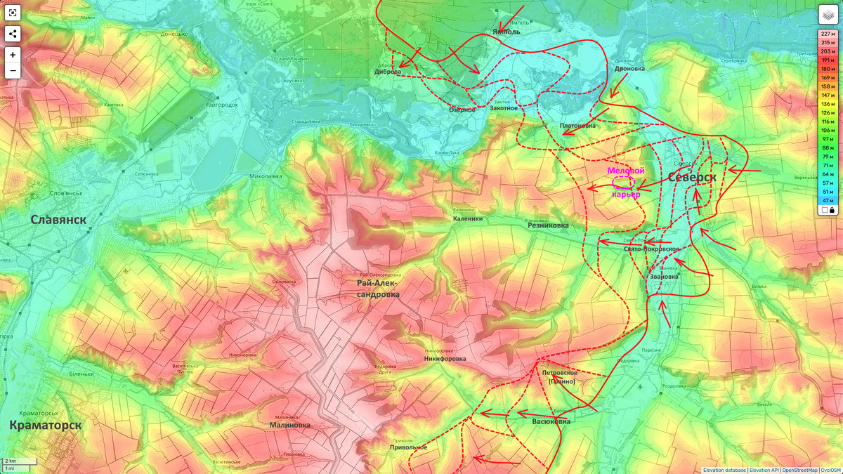 Как и было сказано ранее, противник, оставив Северск, не сумел организовать оборону на высотах западнее города. Он был выбить с территории мелового карьера, а также отброшены со стороны Свято-Покровского в Резниковку. За которую уже начались бои. То, что мы зацепились за Резниковку (ворвавшись в нее буквально на плечах отступающих) крайне важно. Здесь по долине реки Сухой можно, опираясь на жилую застройку сел Резниковка и Каленики (идущие здесь почти без перерыва и на которые можно опираться при наступлении) мы можем дойти до самой Рай-Александровки. Ключевому логистическому центру на пути к Славянску. Освободив который и опираясь на который далее можно уже наступать на этот символический для нас всех город. Держим кулаки и молимся за наших парней...