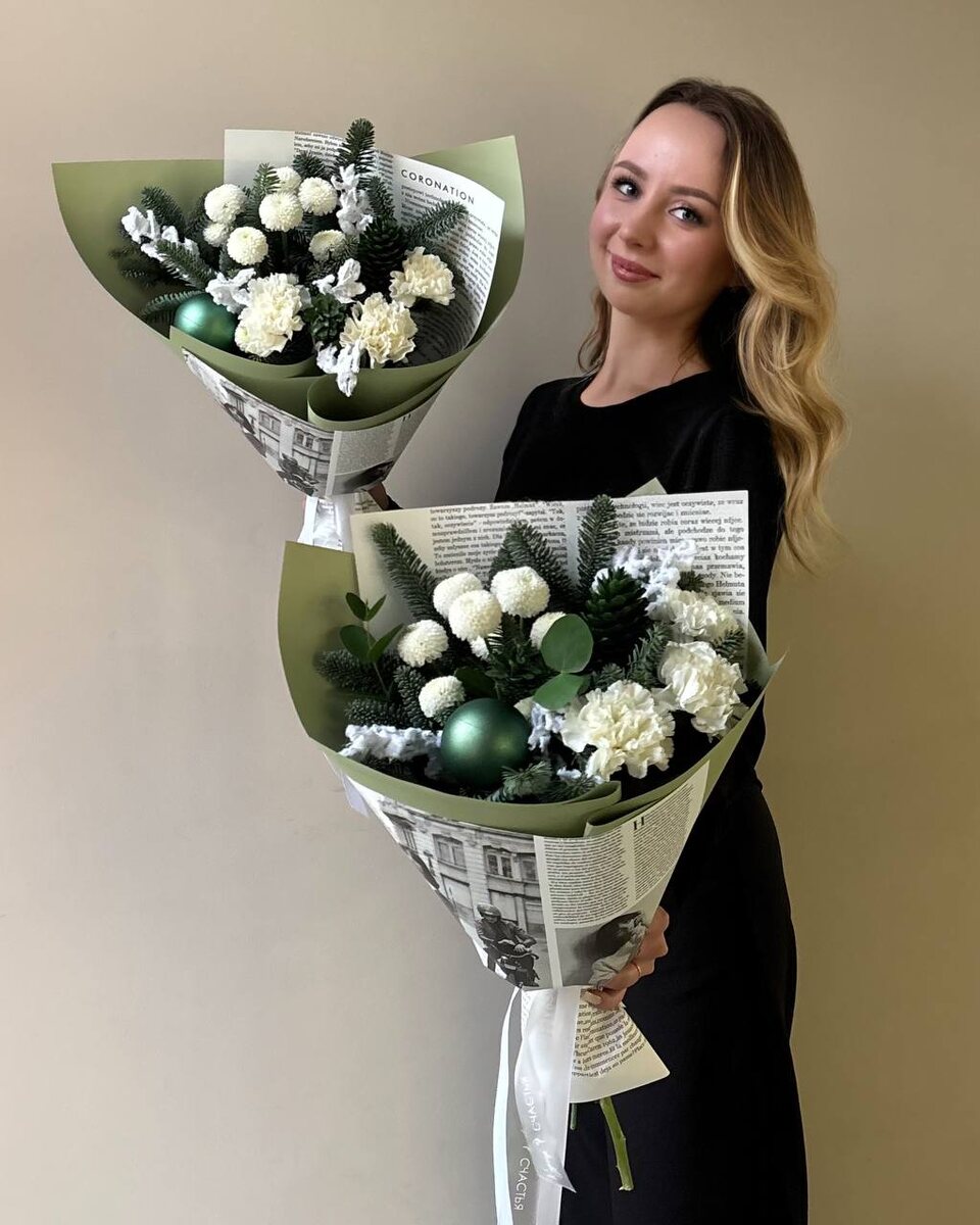 🎻 Зимняя симфония в белом и зелёном Представляем вам букет, который пахнет хвоей, обещает чудеса и выглядит как застывшая новогодняя ночь. В его сердце — благородный нобилис, король хвойных ароматов. Рядом притаились шишки и сверкает ёлочная игрушка — как напоминание о детском трепете под наряженной красавицей. Заснеженная ветка добавляет лёгкий морозный штрих, а нежные хризантемы Ньютон и пушистые диантусы дарят композиции ту самую живую, трогательную нежность. Это больше, чем цветы. Это готовое новогоднее настроение в вазе. 🎁 Подарите себе или самым близким кусочек этой магии: @courrierofhappiness_bot