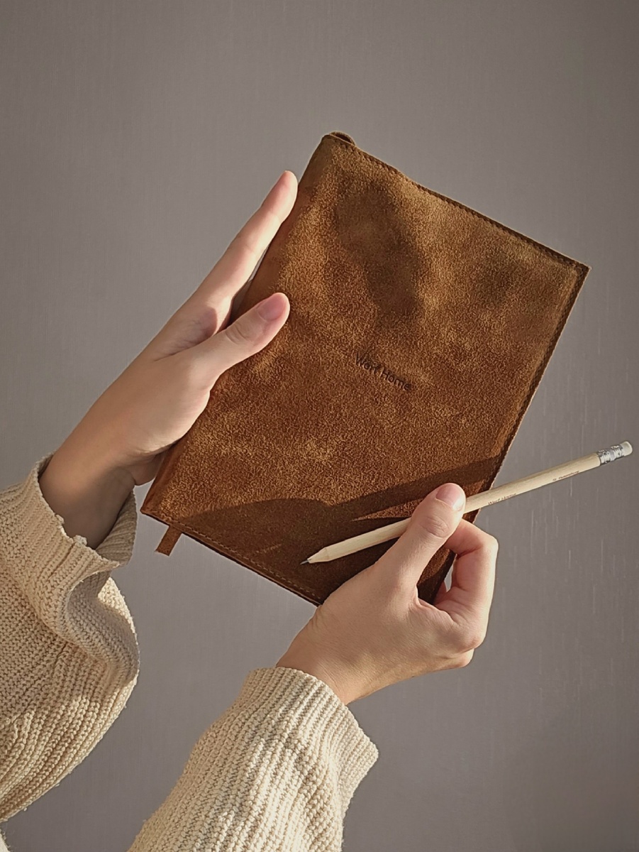 Я взяла сразу полный комплект - и замшевую обложку, и недатированный ежедневник в линейку из крафтовой бумаги. Но можно купить только обложку, а ежедневник подобрать тот, который удобен именно вам - в точку, клеточку, датированный. Главное, чтобы формат был А5.