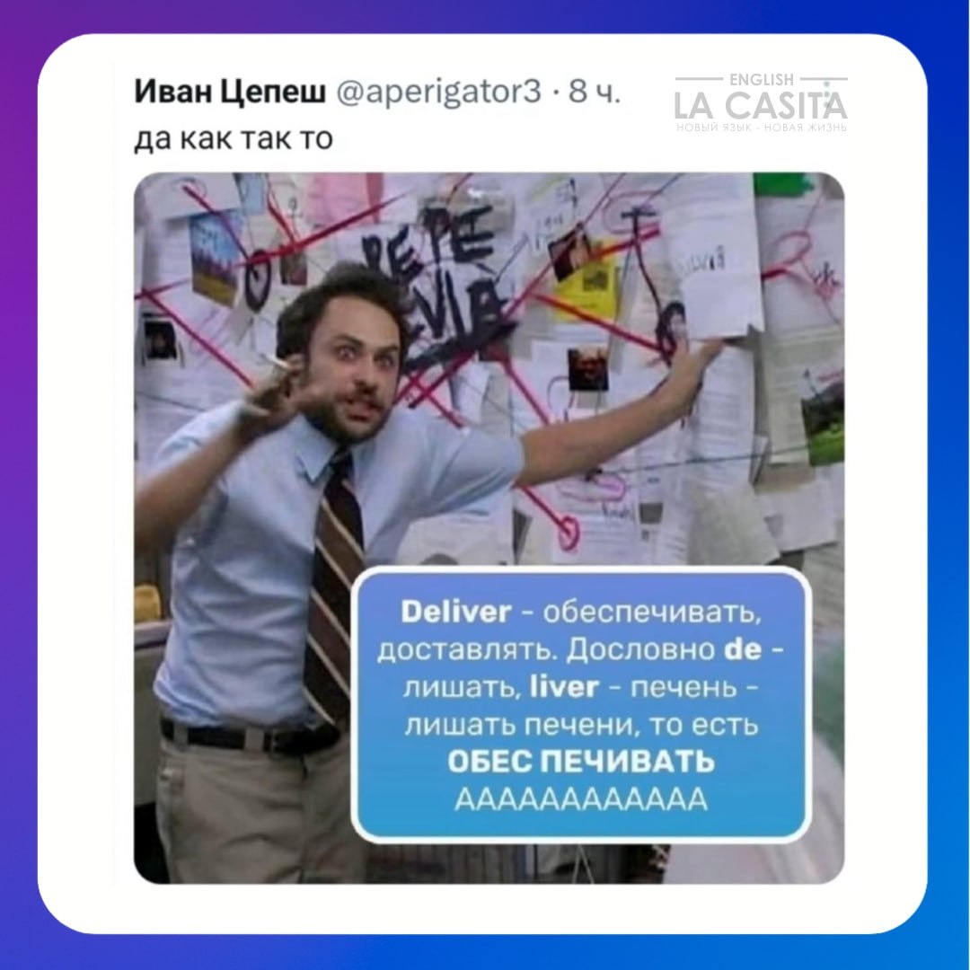 Конечно, картинка угарная — но не ведитесь на такие псевдо-разборы. Пф! Английские слова не работают как конструктор «de + liver = минус печень». Иначе understand значило бы «стоять под чем-то», а butterfly — «масляная муха» 🦋🧈 ⛔️ Так, стоп! Почему и тут можно найти логику? 😹 Ладно, давайте и впрям подушним: 🔍 Настоящее происхождение deliver — от латинского deliberare, «освобождать, передавать». То есть никакой печени не пострадало. Пока. Учимся, смеёмся, обеспечиваем юмором 😎 Подписаться на канал / Наш супер-бот 💝