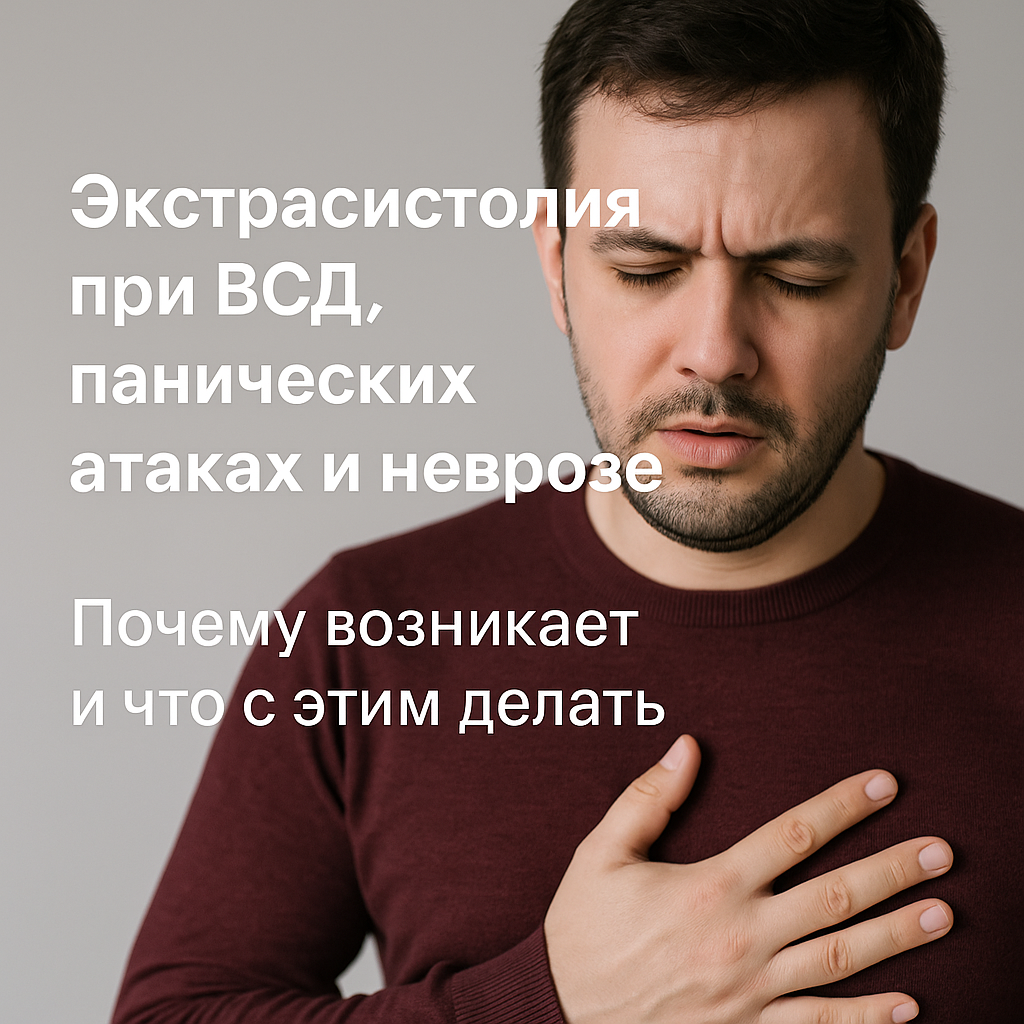 Экстрасистолия — одна из самых пугающих жалоб у людей с вегетососудистой дистонией (ВСД), паническими атаками и неврозом. Ощущение «замирания», «переворота» или «толчка» в груди мгновенно вызывает страх за сердце и жизнь. При этом обследования часто показывают, что с сердцем всё в порядке. Почему же экстрасистолы продолжаются и так пугают? Экстрасистолия — это внеочередное сокращение сердца, которое ощущается как перебой или пауза. Важно: Само ощущение неприятное, но чаще всего не опасное. При ВСД и неврозе нарушается регуляция вегетативной нервной системы. Сердце начинает чутко реагировать на стресс, эмоции и внутреннее напряжение. Основные причины: Чем выше тревога — тем заметнее перебои. Во время панической атаки организм переходит в режим «бей или беги». Сердце ускоряется, дыхание меняется, уровень адреналина растёт. В этот момент экстрасистолы: Возникает замкнутый круг: