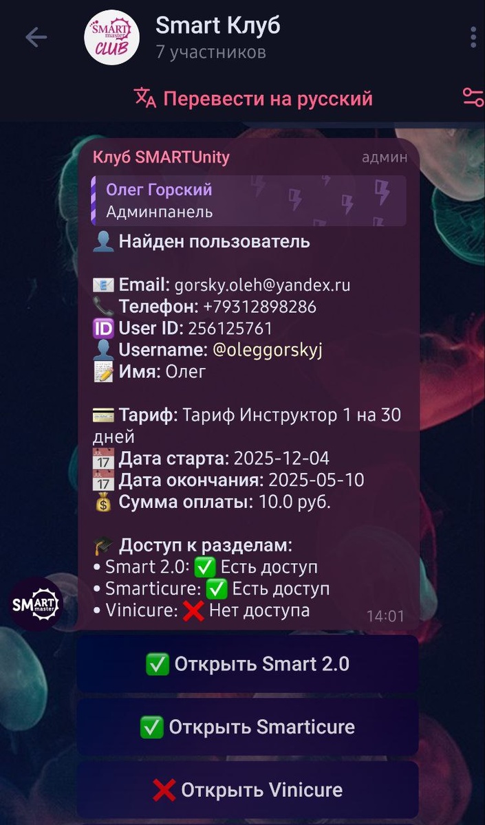 ⭐️ КЕЙС: СЛОЖНЫЙ ТЕЛЕГРАМ-БОТ ДЛЯ УПРАВЛЕНИЯ ОНЛАЙН-КЛУБОМ Хочу показать пример одного из чат-ботов в Телеграм, созданный на коде, а не на конструкторе. Его особенность в том, что любой админ клуба в пару кликов может администрировать клуб по подписке. Изначально не было задачи собирать такую штуку, это был обычный клуб по подписке. Но оказалось, что много нюансов, требующих ручного изменения. Например: - Если оплатил клуб, а потом вылетел, потому что не успел карту пополнить, по идее стоимость становится выше, но владельцы клуба многим идут на уступки, сохраняя цену, и таким людям надо отправить ссылку на оплату со скидкой; - Далее, если участник ранее прошел полный курс, то ему доступны отдельные тарифы, это проверяется по наличию пользователя в геткурсе, но из-за технических проблем на стороне геткурса, пользователь не всегда там есть, и нужно также вручную выдать ему отдельные ссылки на нужные тарифы с оплатой; - Также в клубе много людей и бывает так, что система может кого-