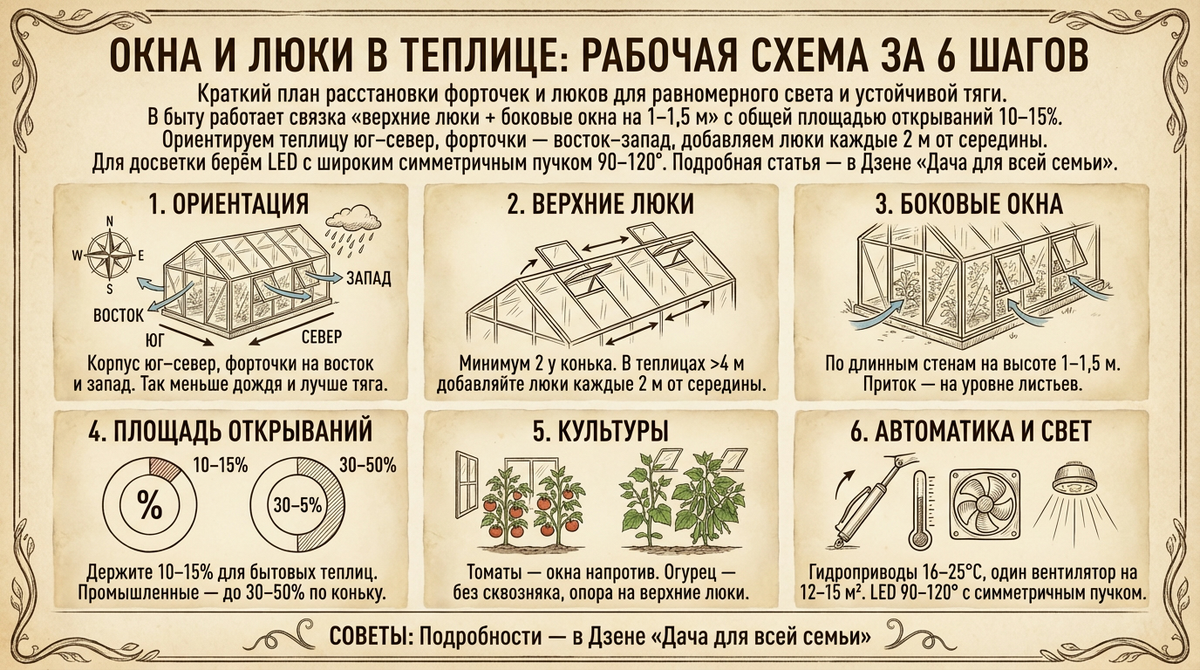 В практических статьях и инструкциях производителей есть три опорные мысли: в промышленных теплицах окна ставят вдоль длинных стен на высоте 1-1,5 м, в быту форточки ставят и сверху, и сбоку, и чем равномернее, тем лучше, а в больших комплексах площадь верхних форточек доходит до 30-50%. В инструкциях по сборке бытовых теплиц встречается рекомендация добавлять люки через каждые 2 м от середины длиной теплицы от 4 м. У нас эти числа бьются с практикой и моей мини-проверкой.