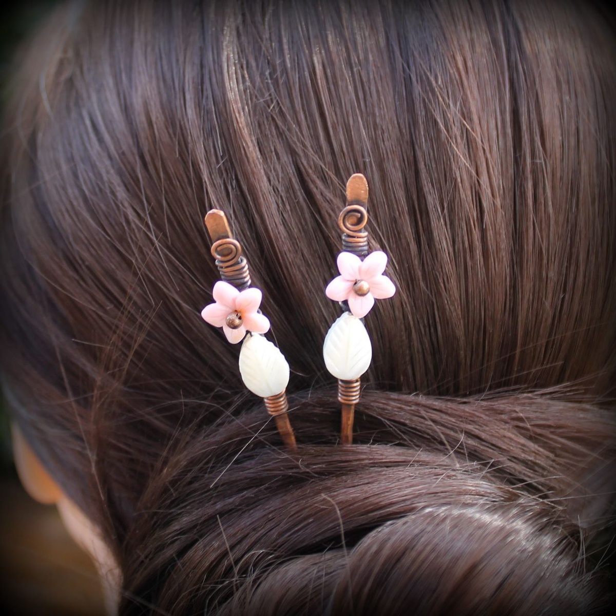 Шпильки Сакура, парные, с перламутром Плотные жесткие шпильки для закалывания волос. Сделаны из меди и бусин. Бусины - резной перламутр в виде листиков и нежных розовых цветочков. Медь покрыта патиной и отшлифована. Не цепляют волосы, не царапают кожу, хорошо держат прическу. Длина 17 см. #медныесказки #ручнаяработа #медныешпильки #шпилькидляволос #перламутр #заколки #палочкидляволос #украшениедляволос