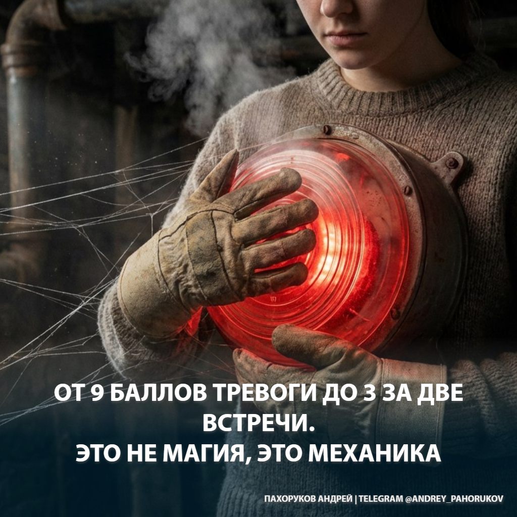 Когда мы начали, Алина оценила свой уровень фоновой тревоги на 9 из 10. Это не просто "волнение". Это постоянное ожидание катастрофы. Каждый звонок с незнакомого номера это трагедия. Каждое опоздание мужа - авария.