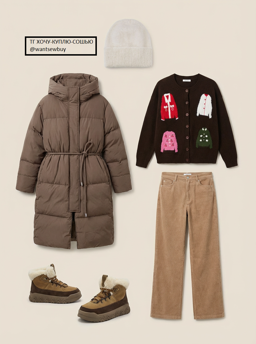 Зима в России разная. В Москве - слякоть и минус пять, в Красноярске - снег по колено и минус тридцать, а в Сочи можно в куртке, но без шапки. И всё это в один и тот же декабрь. Поэтому думать, что зимний гардероб - это шуба, пуховик и валенки, значит лишить себя половины возможностей. Особенно когда впереди Новый год: праздник, на который хочется выглядеть по-настоящему празднично. Давайте разберём шесть зимних образов, которые работают и в мороз, и на улице, и в офисе, и на вечеринке. 1. Пуховик + вельветовые хлопковые брюки + кардиган Пуховик даёт нужный уровень тепла (натуральный пух) плюс трендовый коричневый цвет, вельветовые хлопковые брюки добавляют фактуру и чуть-чуть ретро-настроения, а кардиган собирает всё в уютный многослойный образ. К тому же веселые милые патчи на кардигане вносят радость в хмурые дни. Такой комплект работает и для прогулки, и для повседневных дел: вышли с детьми, заехали в кафе, заодно заскочили на вечернюю встречу - всё в одном. Главный плюс: если снят