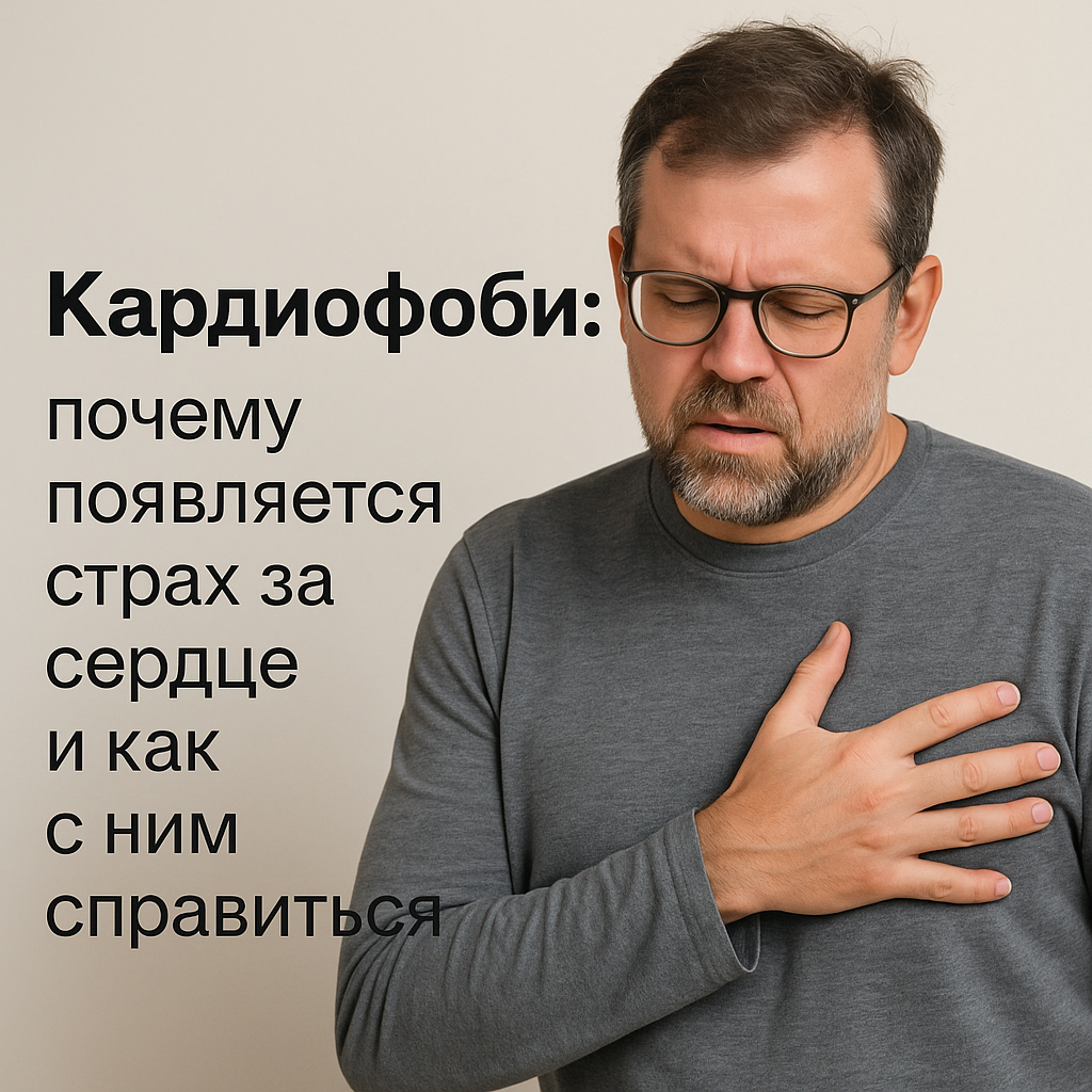 Страх за своё сердце — один из самых мучительных видов тревоги. Любой перебой, укол в груди или учащённый пульс мгновенно вызывают мысль: «Со мной что-то серьёзное, я могу умереть». Так проявляется кардиофобия или кардионевроз — состояние, при котором страх за сердце становится навязчивым и начинает управлять жизнью. Кардиофобия — это сильный страх остановки сердца, инфаркта или внезапной смерти, даже если медицинские обследования не выявляют опасных заболеваний. Кардионевроз — форма тревожного расстройства, при которой: Важно: это не «выдумка» и не симуляция. Ощущения настоящие, но их источник — тревога. Кардиофобия может выглядеть по-разному, но чаще всего включает: Со временем человек начинает жить в режиме постоянной проверки и настороженности. Основная проблема — гиперфокус на теле. Тревожный мозг постоянно сканирует: Любое отклонение интерпретируется как угроза. Это запускает выброс адреналина, который усиливает сердцебиение — и страх только растёт. Возникает замкнутый круг: