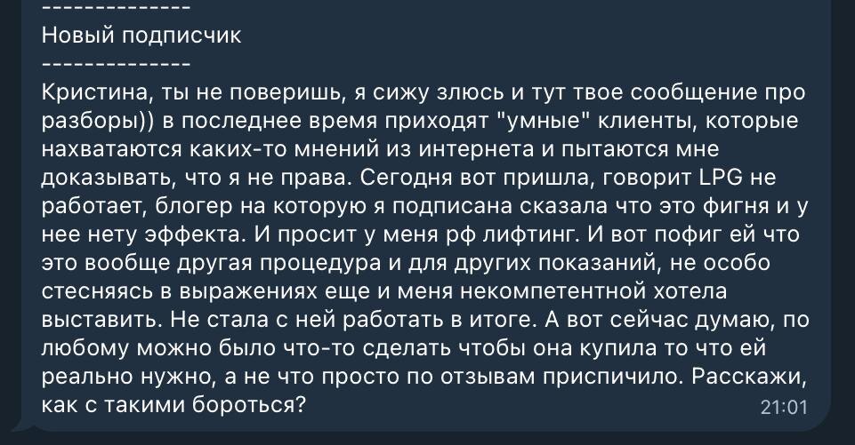 Этот кейс встречается всё чаще — особенно в последнее время. Мессенджеры, соцсети, чаты и группы для мастеров давно перестали быть закрытой профессиональной средой. Там присутствуют клиенты, знакомые клиентов, «советчики», блогеры и люди с самым разным опытом. И именно оттуда появляется типичная ситуация: клиент приходит на процедуру уже с готовым мнением, услышанным где-то извне. «А вот блогер говорил, что это не работает» «Мне подруга сказала, что LPG — бесполезно» «В чате написали, что от этого нет результата» Как правильно вести себя мастеру в таких ситуациях — и почему спор здесь всегда проигрышный? Кристина Казанцева — предприниматель и эксперт в сфере коррекции фигуры с 15+ годами опыта. Основатель Slim Business School — онлайн-школы для мастеров и владельцев студий, организатор чемпионата России по коррекции фигуры Slim Award. Когда клиент приходит с чужим мнением, он не спорит лично с вами как со специалистом. Он защищает ту картину мира, в которую уже успел поверить. И если м