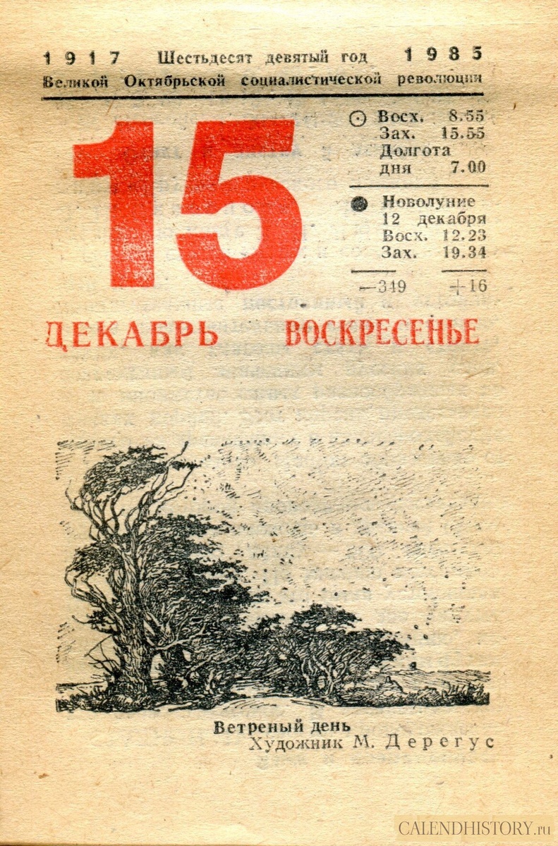 Листок советского отрывного календаря 40-летней давности. 15 декабря 1985-го года — Календарь Политиздата Ветреный день. Художник М. Дерегус Больше старых советских отрывных календарей смотрите у нас на сайте - calendhistory.ru https://calendhistory.ru/15-dekabrja-1985-go-goda-kalendar-politizdata/