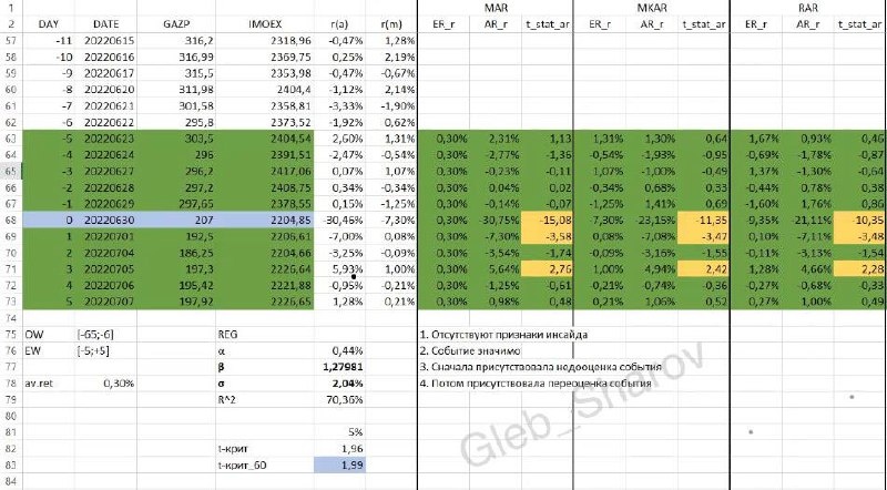🔎 СОБЫТИЙНЫЙ АНАЛИЗ: возможно ли установить НАЛИЧИЕ ИНСАЙДА в акциях? КЕЙС: снижение акций Газпрома на 30% в 2022 году из-за отмены дивидендов. P.s. Сделал модельку в Excel, кто захочет покапаться можете написать в чат – каждому пришлю в лс, чтобы вы более детально всё посмотрели. Перед тем, как анализировать «эффект» какого-то корпоративного события или какой-либо рыночной ситуации, важно правильно подобрать объекты. Грубо говоря, какое-нибудь заседание ОПЕК может даже условный Яндекс задеть в теории, через длинную цепочку макрофакторов и прочего, но влияние будет слабым и размытым. Поэтому в рамках событий вокруг того же ОПЕК нужно оценивать влияние там, где связь самая прямая и где логичнее ожидать реакцию – в первую очередь в нефтяных компаниях, а не пытаться натянуть событие на весь рынок. Событийный анализ позволяет разделить общую доходность на 2 части: ▪️Ожидаемую – то что рынок ожидал в обычных условиях. ▪️Аномальную – это отклонение от «нормальной» доходности, вызванн
