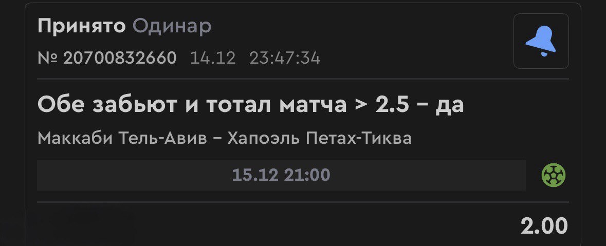 Матч номер два, тоже зачетный 🍔 Маккаби: (3 место чемпионата) ✅ Забивают более 1 гола в 6 из 7 последних матчей ✅ Дома забивают более 1 гола в 5 из 6 встреч ✅ Забивают 2.2 гола в среднем за игру в сезоне Хапоэль: (кто любит ничьи - это шанс!) ✅ 6 из 7 их последних матчей с ничьей ✅ пропускают в 5 из 6 последних матчей уже в первом тайме ✅ В среднем пропускают 1.8 гола за игру ✅ 9 матчей без побед - против топ-клуба, после пропуска (а они пропустят в обороне 100%) и ради ничьи пойдут в атаку, и один, но забить должны! У Маккаби проблем с обороной нет, но и они пропускают 1.1 в среднем за игру. У гостей 1.3 забитых в среднем, но их ничейная серия доказывает, что забивать тоже умеют! Можно конечно забрать ОЗ + П1, но я такое не люблю, вообще 😮💨 а в голешники верю!