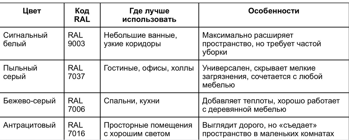 Сейчас в дизайне терраццо популярны нейтральные оттенки. Ниже мы собрали таблицу с самыми востребованными цветами и их особенностями: