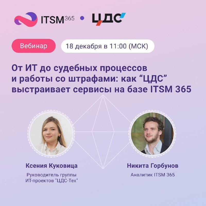 📣 18 декабря в 11:00 МСК приглашаем на вебинар: «От ИТ до судебных процессов и работы со штрафами: как девелопер “ЦДС” выстраивает сервисы на базе ITSM 365» На примере клиентского кейса расскажем, как создать единый контур автоматизации без многомесячных доработок и перевести сложные процессы в измеримый и предсказуемый формат. На встрече узнаете, как: — Быстро переехать с разрозненных инструментов в единую систему — Настроить и вести работу с претензиями, судебными делами и исполнительными производствами, контролировать оплату штрафов ФССП и ГИБДД — Управлять выдачей цифровых ключей безопасности с помощью конструктора бизнес-процессов — Повышать продуктивность команд и сокращать время обработки заявок до 30%, пользуясь метриками и отчетами Регистрируйтесь по ссылке, ждем вас! 🔗 #вебинар