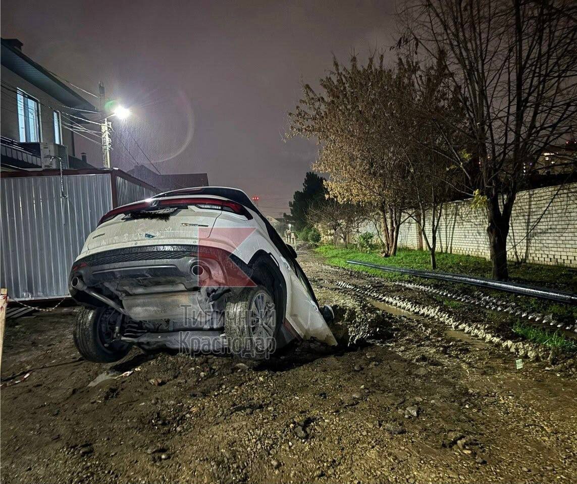 😱 Автомобиль провалился в яму на улице Есенина около дома 21 в Краснодаре