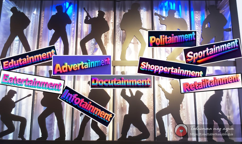 Понедельничное. Не слишком ли мы много развлекаемся? Судя по новым словам-портманто (о том, что это такое, можно почитать здесь), слово entertainment (развлечение) приклеивается ко всему подряд. Например, ✨ Edutainment образование + развлечение. Когда математику объясняют через танцы с бубном, а всё остальное через мемы. ✨ Infotainment информация + развлечение. Новости, поданные так, чтобы не скучно было смотреть. Факты с приколами. ✨ Advertainment реклама + развлечение. Элементы рекламы и развлечений, чтобы привлекать потребителей косвенным образом, не прибегая к прямой рекламе. Это может быть интеграция бренда в фильм, телешоу или видеоигру, или создание целого развлекательного контента, где бренд является неотъемлемой частью сюжета. ✨ Politainment политика + развлечение. Политики танцуют в TikTok, дебаты превращаются в цирк. Ещё так говорят о программах в СМИ на политические темы. ✨ Shoppertainment шопинг + развлечение. Тренд, объединяющий электронную коммерцию и развлечения,