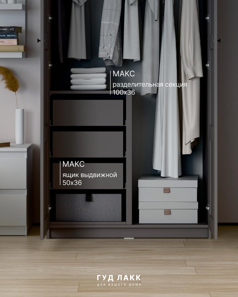 👍👍👍👍👍 Один элемент — максимальная польза Разделитель в шкафу или гардеробной — ваш инструмент для эффективного хранения. Используйте его для порядка и быстрого доступа к вещам. Если шкаф используется: • В прихожей — повесьте верхнюю одежду на штангу, а снизу разместите полки или ящики для обуви, сумок и аксессуаров. • В спальне — для одежды используйте штангу, а для футболок и белья установите полки и выдвижные ящики с разделителями. Также можете встроить в нижнюю часть брючницу. • Для хозяйственных нужд — выделите место для пылесоса и химии, установив удобные полки и ящики с разделителями для мелких предметов. В ГУД ЛАКК для ваших МАКСов есть: Т- и Г-образные разделители, полки, выдвижные ящики, брючницы и не только. Выбирайте конфигурацию под свои нужды.
