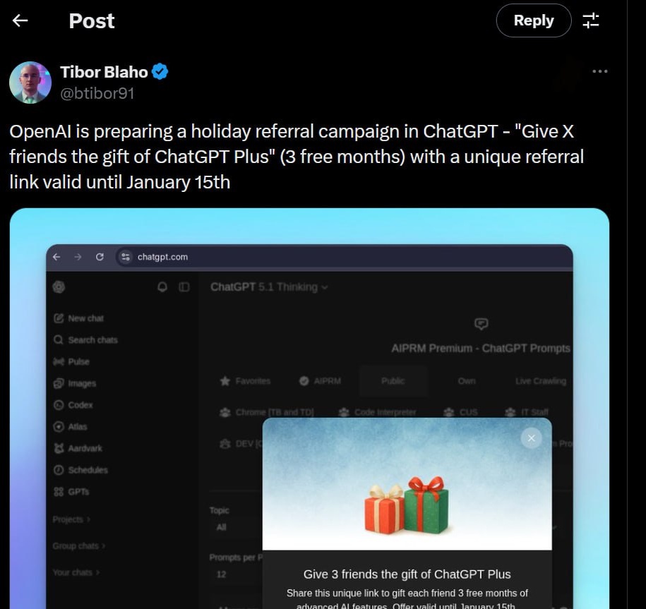OpenAI готовит праздничную реферальную акцию в ChatGPT 🎁 OpenAI замечена за подготовкой праздничной-кампании в ChatGPT: пользователям PRO-аккаунтов предложат подарить доступ к ChatGPT Plus друзьям. Механика простая — через персональную реферальную ссылку можно будет раздать трем друзьям по три месяца Plus бесплатно, а сама акция будет действовать до 15 января. #нейросети #ИИ #нейросеть #искусственный_интеллект