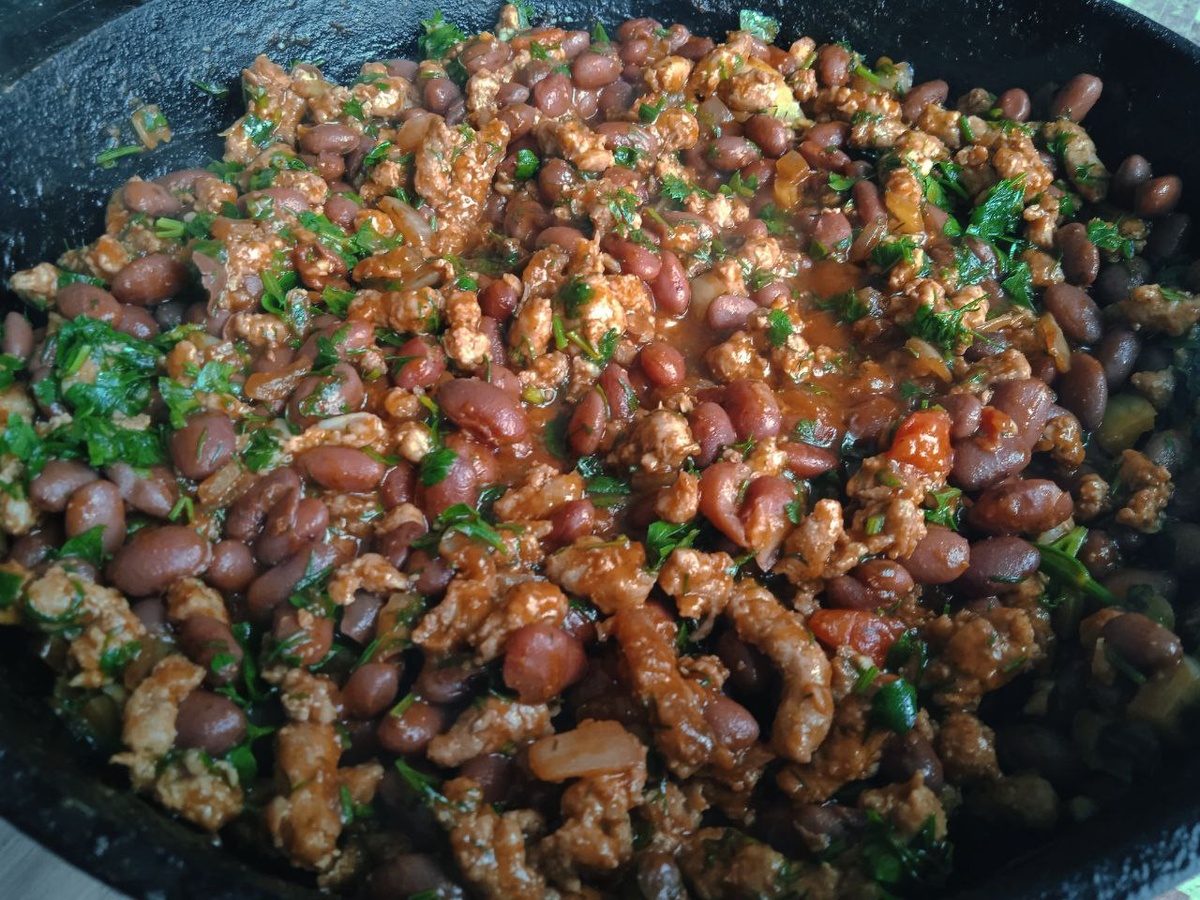 Кто зашел кидаться тапками, лучше сразу разворачивайтесь. Потому что, конечно, это не совсем лобио, или совсем не лобио. Хотя, если исходить из того, что слово "лобио" - это просто "фасоль" по-грузински, то никакой претензии не предъявишь - фасоль с мясом. И сразу скажу, что идея этого блюда принадлежит моей снохе Насте. Правда, от ее рецепта остались только фасоль и фарш. Итак, сначала картинка. Живьем вкуснее выглядит, но я уже говорила, что фотографировать еду не умею. А вот рецептик. Поджариваем фарш (любой) примерно полкило, добавляем в него две банки фасоли консервированной в собственном соку (сок сливаем). Можно сварить, конечно, но я за простоту. В отдельной сковородке обжариваю мелко нарезанный лук (1 средняя луковка), болгарский перчик (можно без него), пару задохлых свежих помидорок (в такие блюда хорошо уходят овощи, которые уже не пригодны для салатов). Все мелко режу и кидаю по мере нарезания к луку. К этому добавляю либо томатную пасту либо помидоры рубленные конс