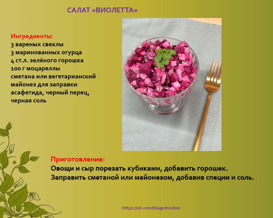🥗 САЛАТ «ВИОЛЕТТА» 🌀 Ингредиенты: 3 вареных свеклы 3 маринованных огурца 4 ст.л. зелёного горошка 100 г моцареллы сметана или вегетарианский майонез для заправки асафетида, ч.перец, ч.соль 🌀 Приготовление: Овощи и сыр порезать кубиками, добавить горошек. Заправить сметаной или майонезом, добавив специи и соль.