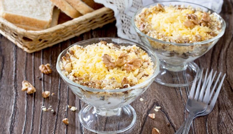В результате получится восхитительная, нежная закуска с выразительным ореховым акцентом. Но стоит помнить, что из-за состава (особенно майонез и орехи), это блюдо отличается высокой калорийностью.