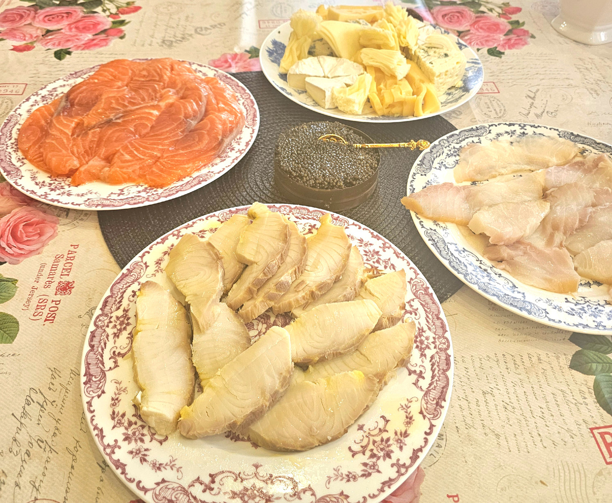 Один из наших традиционных праздничных сетов Русского стола. Иностранцы, которые приезжают в Россию и заходят в наши супермаркеты и рынки удивленно восклицают: "А у них оказывается все есть". Да, у нас все есть, мы давно не босоногие кривозубые кресттяне до Петра I и не голодная послевоенная Россия, по нашим широким асфальтрированным дорогам давно не ходят медведи, мы давно едим не одну картошку, свеклу и кашу и не носим лапти, полки наших супермаркетов и рынков ломятся от изобилия. По 20 и более сортов рыбы, икры, морнпродуктов, мясной гастрономии и пр. Наш традиционный сет на торжественные события: Осетр горячего копчения, осетр холодного копчения, слабосоленая семга, Икра черная осетра, Ассорти сыров: бри, камабер, маасдам, эммениаль, голандский, швейцарский, тет-де-муан, гауда, блю чиз с синей плесенью,,рокфор с зеленой плесенью Сколько я себя помню этот сет всегда был на наших праздничных столах поэтому хронологию точную сказать не могу ;) Естественно , это не единсивенн