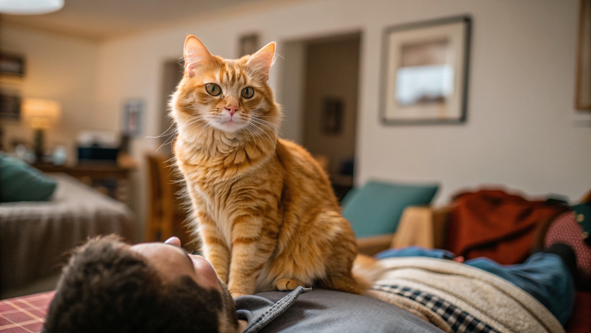 Когда кошка сидит на вашей груди, она контролирует ваши движения. Вы не можете встать, не можете резко повернуться, не можете уйти без её разрешения. Кошка это понимает. Для территориальных кошек это способ показать: я здесь главная. Я решаю, когда вы встанете.