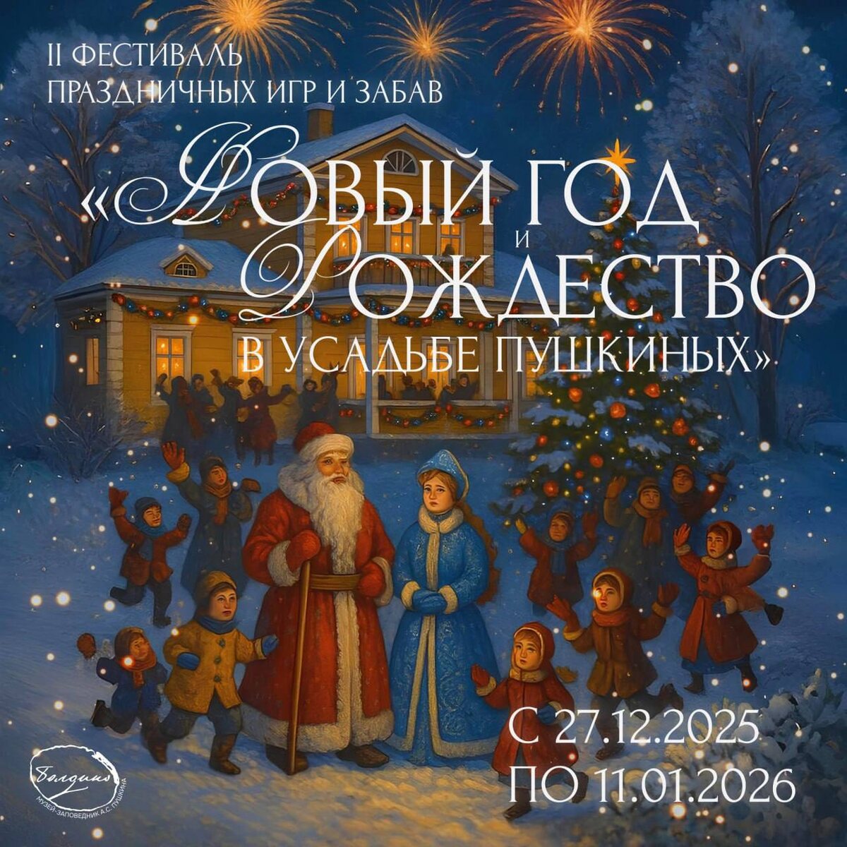 II Фестиваль праздничных игр и забав «Новый год и Рождество в усадьбе Пушкиных» в музее-заповеднике А.С. Пушкина «Болдино»! ✨27 декабря в музейном сквере: 13:00 – Торжественное открытие Фестиваля 13:00 – Открытие Дома Деда Мороза 13:00 – Презентация комплексного иммерсивного новогоднего маршрута Ежедневно (27.12.2025 – 11.01.2026, кроме 29.12.2025) 🎅Дом Деда Мороза: - Интерактивная новогодняя программа «В гостях у Деда Мороза» - Встречи с Дедом Морозом и Снегурочкой - Чтение стихов А.С. Пушкина и других поэтов - Получение сладостей и новогодних открыток Сеансы: 11:00, 11:30, 12:00, 12:30, 13:00, 13:30, 14:00, 14:30, 15:00, 15:30, 16:00, 16:30, 17:00, 17:30 🎫Билеты в кассе музея 🏛Дом культуры 1937 года: - Новогодняя ель в концертно-выставочном зале - Отправка новогодних открыток через «волшебный» почтовый ящик - Мастер-классы (группы до 20 человек): - Пишем гусиным пером (7+) - Роспись новогодней игрушки (3+) - Изготовление рождественской звезды (10+) Сеансы: 11:30, 12:30, 14: