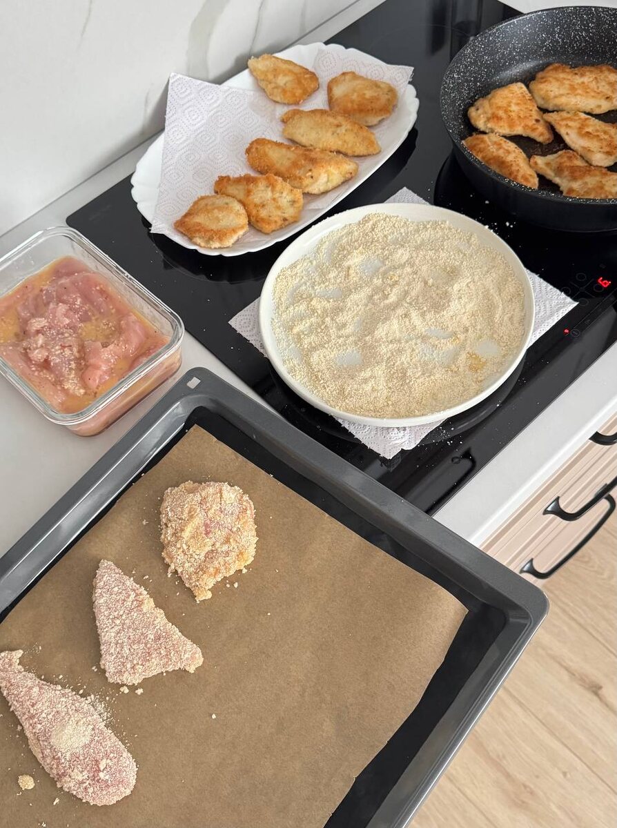 Хочешь с маслом, хочешь без. И не нужны никакие дополнительные гаджеты. Куриное филе в панировке. Филе замариновала с вечера соль + перец. Утром готовлю. Сухари панко предварительно измельчаю, чтобы помельче были, смешиваю с сушеным молотым чесноком и в этой смеси обваливаю.