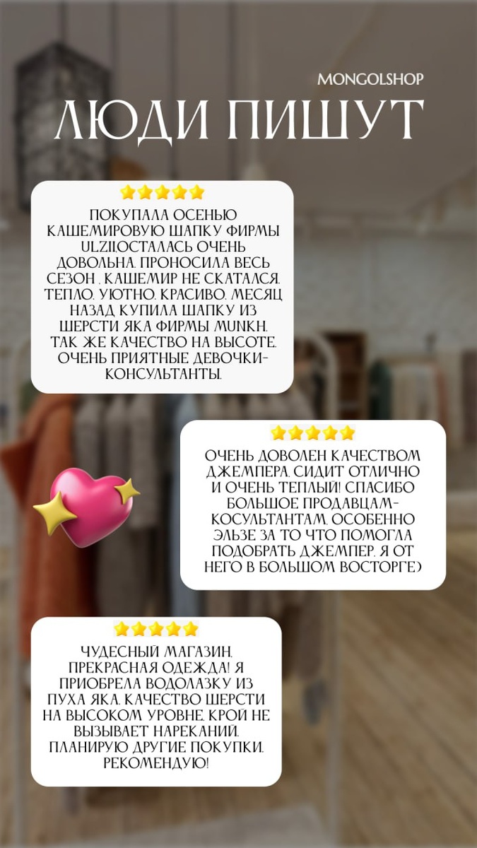 Открываем рубрику “Люди говорят” Мы очень любим читать ваши отзывы. В них — честность, доверие и та самая искренность, которая помогает нам становиться лучше.🤍 Вы рассказываете, как кашемировая шапка проходит целый сезон без единого катышка. Как варежки становятся идеальным подарком. Как гольфы из верблюжьей шерсти согревают на даче и в городе. Как консультанты помогают найти “ту самую” вещь. Такие слова — не просто обратная связь. Это напоминание, что натуральные материалы, внимательный сервис и тёплая атмосфера действительно важны. Мы бережно читаем каждую вашу историю. Спасибо, что доверяете нам своё тепло.❤️ Москва: https://yandex.ru/maps/-/CLsTeLoP https://go.2gis.com/Q5dEo Санкт‑Петербург: https://yandex.ru/maps/-/CLsTiIKn https://go.2gis.com/9O6lQ Новосибирск: https://yandex.ru/maps/-/CLsTmKYt https://go.2gis.com/Bsxwc