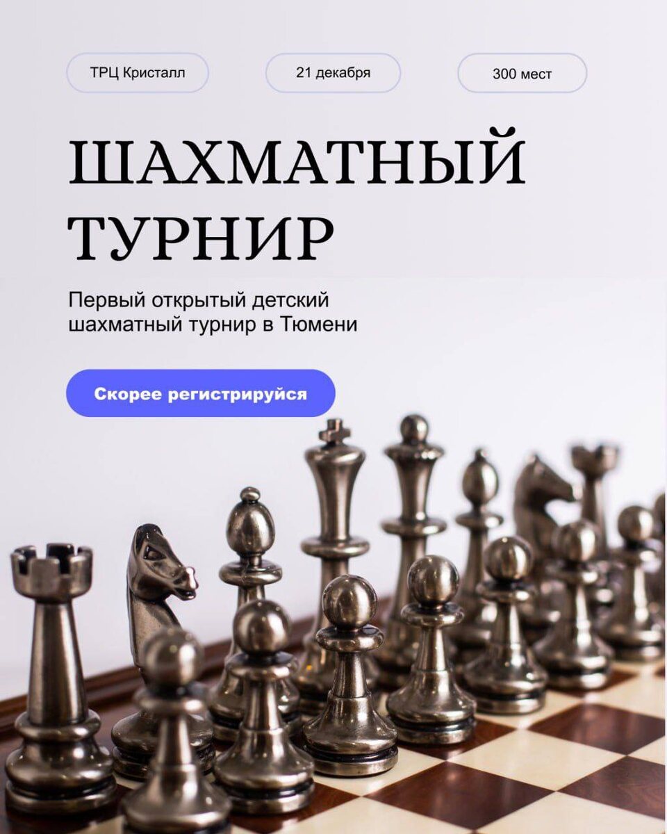 Открытый детский шахматный турнир «Кристалл Open» уже скоро! 21 декабря в Тюмени на площадке ТРЦ «Кристалл» состоится одно из самых ярких спортивных событий этой зимы — крупный детский шахматный турнир для игроков 2012 г.р. и младше. Это отличная возможность для юных шахматистов проверить силы в настоящем соревновании, получить опыт игры по швейцарской системе и побороться за впечатляющие призы 🎉 Регистрация по ссылке: https://docs.google.com/forms/d/e/1FAIpQLSdhL8JyxJXbeEDwjvVCVHuSq9VUnsIOD946qpRSVLsYOhpV2A/viewform