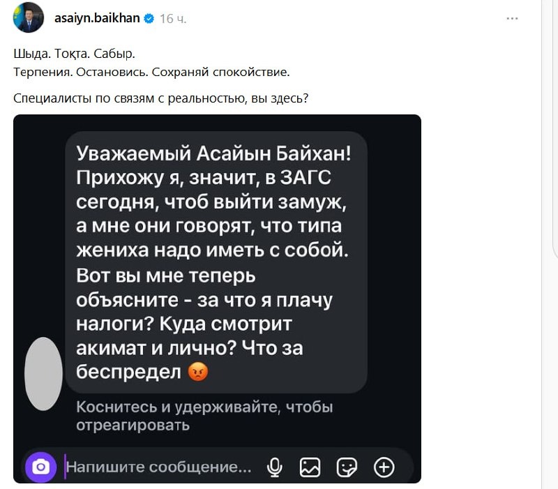 Куда смотрит акимат? Главе Павлодарской области пришлось "отвечать" за женихов Аким Павлодарской области Асаин Байханов, набирающий популярность среди казахстанских пользователей благодаря постам в социальных сетях, ответил на претензии по отсутствию женихов в регионе. "Крик души" прилетел от одной из подписчиц. "Терпение. Остановись. Сохраняй спокойствие. Специалисты по связям с реальностью, вы здесь?" – написал Байханов в ответ. К слову, мнения пользователей разделились. Некоторые посетовали, что в стране до сих пор не запустили региональные программы по выдаче женихов и посоветовали акиму подготовить обоснование. Байханов заявил, что точно знает о дефиците невест и старается их привлекать. ❤️А вы как думаете, есть в стране проблемы с женихами и что должны делать акиматы? Фото: threads ✍️Подписывайтесь на t.me/CMN_KZ