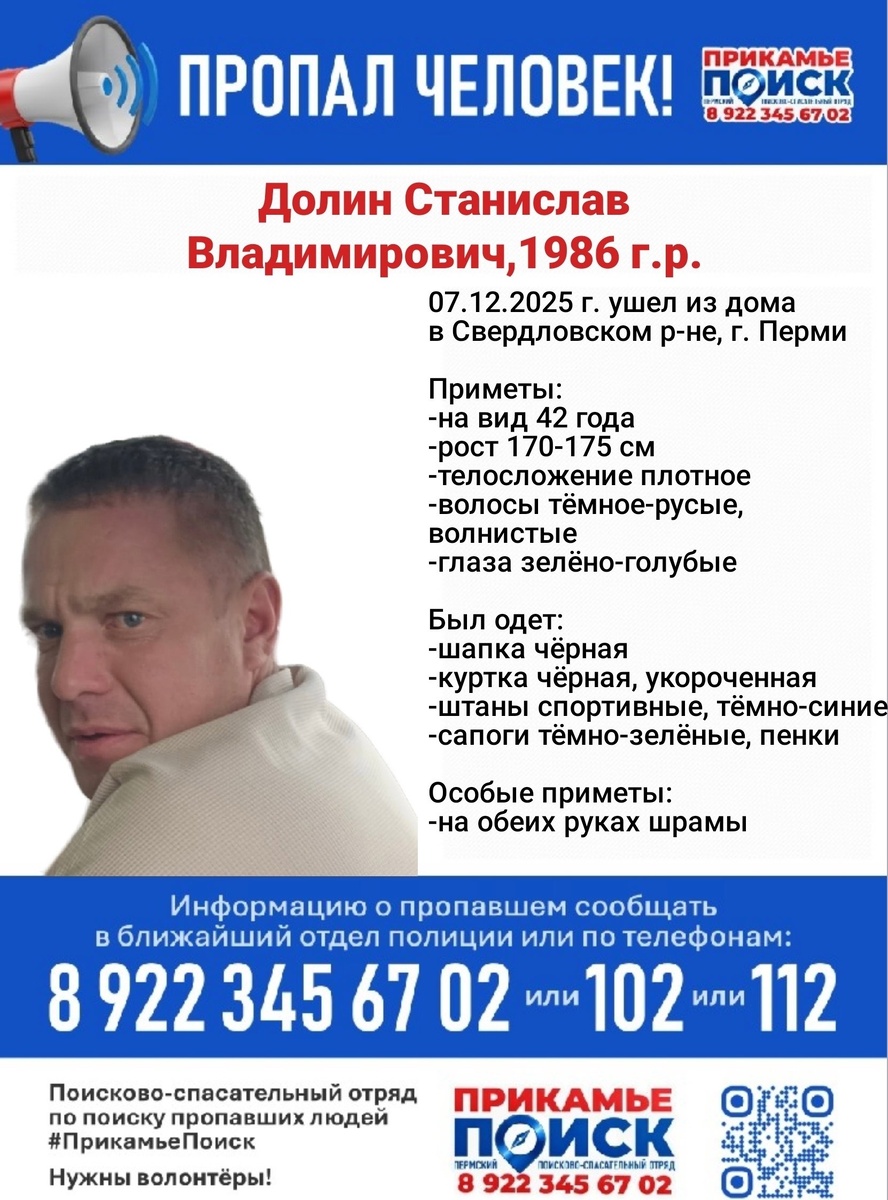 ❗ВНИМАНИЕ❗ПРОПАЛ❗ ДОЛИН СТАНИСЛАВ ВЛАДИМИРОВИЧ,1986г.р. 07.12.2025 г. ушел из дома в Свердловском р-не, г. Перми Если вам что-либо известно о пропавшем человеке, просьба сообщить по телефонам: 8 922 34567 02 или 112 #ПрикамьеПоиск #poisk342 #Пермь