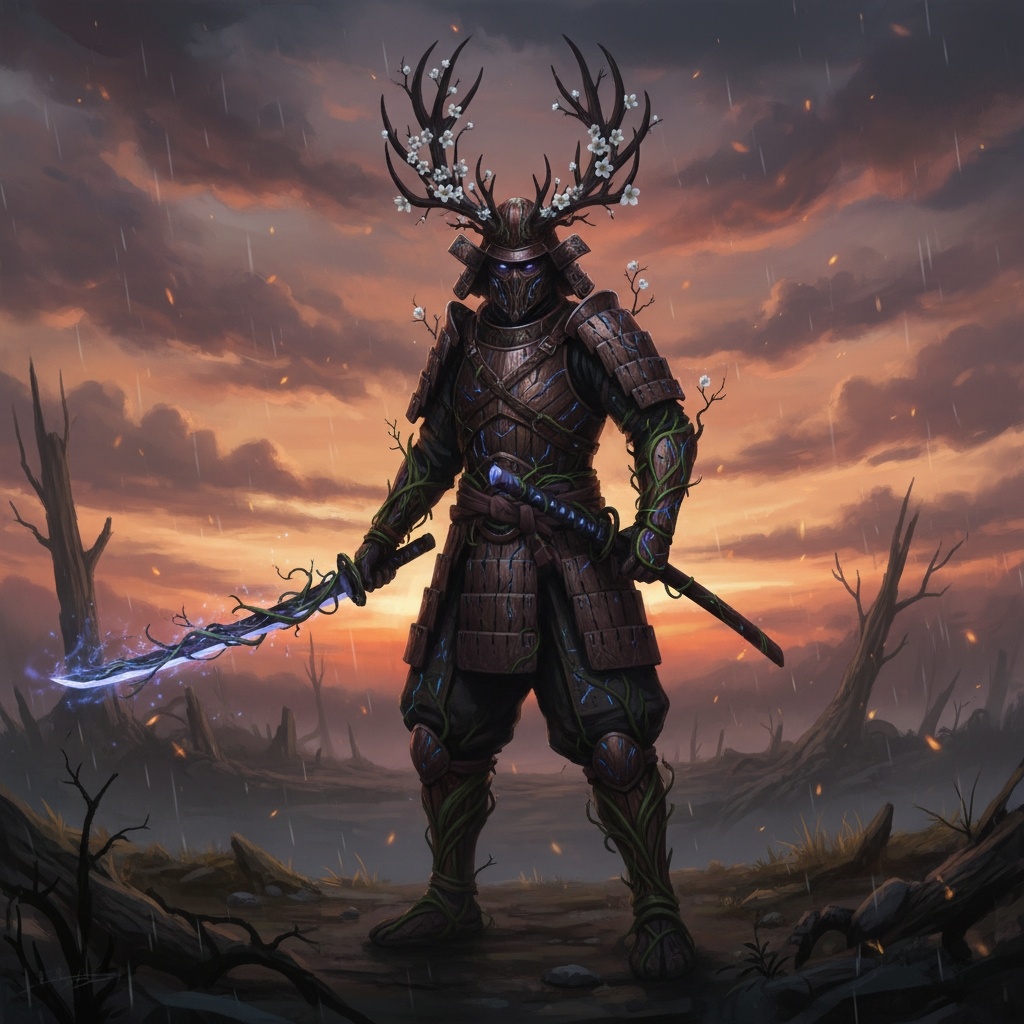 Перед вами — воплощение древней силы и гармонии с природой. Этот самурай словно вышел из легенд: его доспехи сплетены с ветвями, а рога, украшенные цветами, напоминают о единстве человека и мира вокруг. 🌳✨ Что делает этот образ таким завораживающим? Доспехи, как живая кора. Каждая пластина будто выросла из дерева, а лозы оплетают ноги и руки, подчёркивая связь с землёй. Рога с цветами — символ мудрости и цикличности природы: увядание и расцвет, жизнь и смерть, борьба и покой. Клинок, светящийся магией. Меч не просто оружие — он наполнен энергией леса, его свет словно отражает душу воина. Пейзаж за спиной: мрачный, но величественный закат, дождь и мёртвые деревья создают атмосферу древней битвы, где на кону — сама природа. Этот самурай — не просто воин, а хранитель баланса. Он защищает леса от разрушения, несёт в себе силу стихий и помнит все истории, которые поведал ветер. Его миссия — сохранять гармонию между человеком и природой, даже если для этого придётся вступить в бой. 🪨🌿