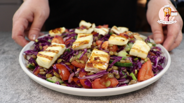 Хотите яркий и сытный салат? Секрет — в жареном сыре и зеленой чечевице!