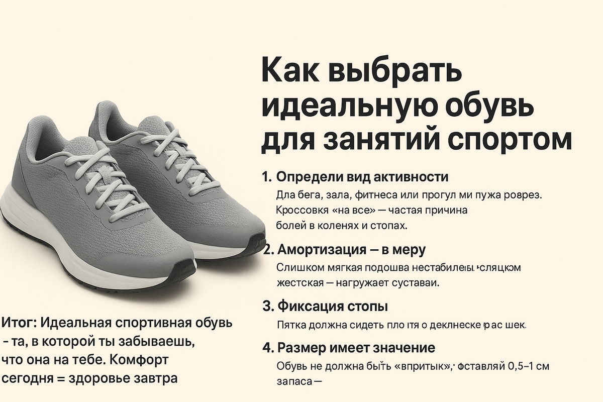 Правильная спортивная обувь — это не про бренд и не про внешний вид. Это про здоровье суставов, комфорт и результат тренировок. 1. Определи вид активности Для бега, зала, фитнеса или прогулок нужна разная обувь. Кроссовки «на всё» — частая причина болей в коленях и стопах. 2. Амортизация — в меру Слишком мягкая подошва нестабильна, слишком жёсткая — нагружает суставы. Ищи баланс под свой вес и нагрузку. 3. Фиксация стопы Пятка должна сидеть плотно, без скольжения. Хорошая фиксация снижает риск травм и усталости. 4. Размер имеет значение Обувь не должна быть «впритык». Оставляй 0,5–1 см запаса — особенно для бега и длительных тренировок. 5. Дышащие материалы Сетка и современные ткани уменьшают перегрев и риск мозолей. Итог: Идеальная спортивная обувь — та, в которой ты забываешь, что она на тебе. Комфорт сегодня = здоровье завтра.