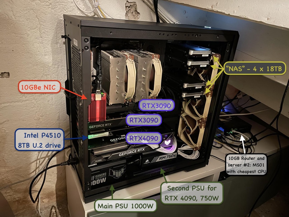 Чел хвастается домашним монстром, собранным для локальных LLM: огромный корпус Phanteks Enthoo Pro 2 Server, связка ASRock X570 Taichi и Ryzen 3950X. Внутри три видеокарты, две RTX 3090 и одна RTX 4090, причем 4090 сидит через цепочку M.2, Oculink, PCIe и питается от второго блока питания. Хранилище с размахом: Intel P4510 на 8 ТБ U.2 NVMe под виртуалки и четыре HDD Seagate Exos по 18 ТБ под TrueNAS в виртуалке, плюс 10GBe сетевая карта тоже через M.2, PCIe переходник. По скорости LLM автор гордится тем, что GPT OSS 120B полностью в видеопамяти выдает около 109 токенов в секунду вместо 16 токенов в секунду на двух 3090 с CPU offload... Еще раз отмечу - 100 токенов в секунду или 300 символов русского языка в секунду выдает это чудовщие :) Вложения примерно 6370 долларов: CPU 750, материнка 250, RAM 400, NVMe U.2 8 ТБ 650, четыре HDD 18 ТБ по 300 это 1200, 10GBe 100, два M.2 райзера 100, корпус 200, блоки питания 120 и 250, две RTX 3090 по 700 это 1400, RTX 4090 1300. В РФ сразу при