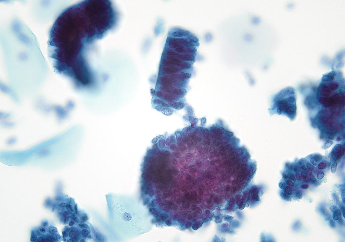 Эндоцервикальную аденокарциному in situ (AIS) значительно легче распознать при наблюдении фрагментов, развернутых боком («плоские полоски»), чем при рассмотрении их анфас Препарат, приготовленный методом ЖЦ (SurePath), окрашенный по Папаниколау, объектив 40x. #цитология #цервикальнаяцитология #пап
