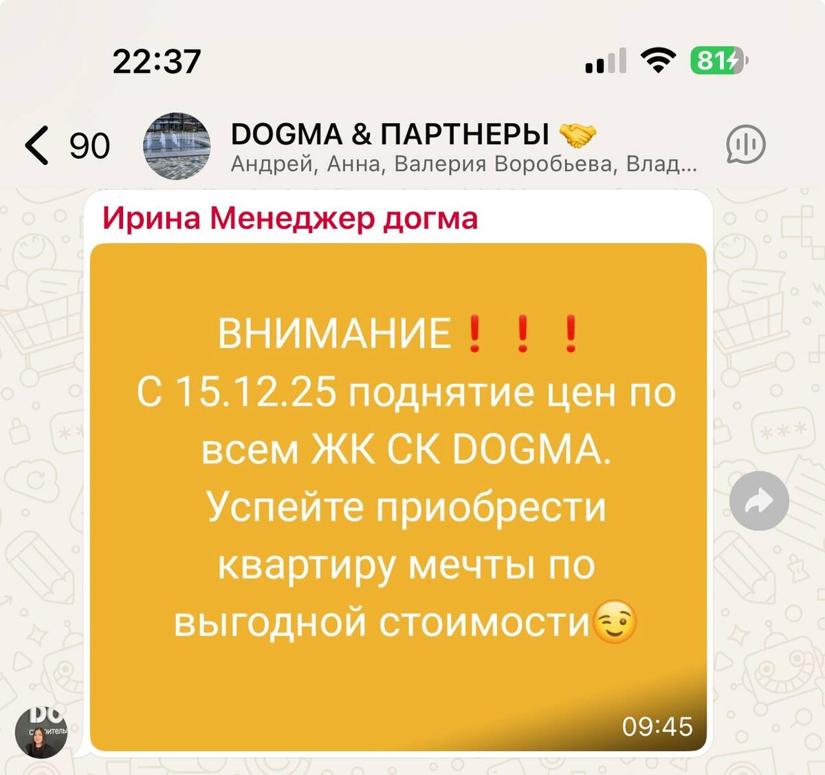 Повышение цен в новостройках! Друзья, важная новость для тех, кто сейчас выбирает квартиру: ✅ ДОГМА — повышение цен с 15.12.2025. На сколько именно — пока не озвучили. ✅ ССК — повышение цен с 16.12.2025: ориентировочно +5 000–10 000 ₽ за квм во всех комплексах. Если вы планировали покупку или бронирование — лучше зафиксировать цену до повышения. Напишите нам — подскажем по наличию, условиям и поможем забронировать подходящий вариант.